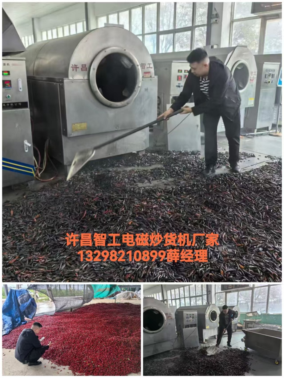 10月12日,貴州客戶來(lái)廠考察電磁炒貨機(jī)炒辣椒。